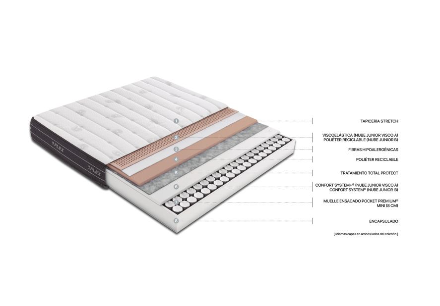 - Firmeza. En cuanto a su firmeza, el Nube Junior A cuenta con un sistema de muelles ensacados Pocket Premium® Mini de 8 centímetros, una carcasa de muelles embolsados de manera individual que aportan una total independencia de lechos y una firmeza progresiva para adaptarse al cuerpo de los más pequeños de la casa durante las horas de sueño.